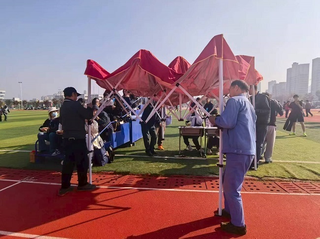 运动会筹备工作千头万绪,总务处与教务处紧密协同,提前数周便进入了“备战”状态。他们的工作清单具体而细微:从主席台、裁判席、医疗点的场地布置,到确保指令能清晰传遍赛场每个角落的音响设备反复调试,以及设立医疗点、配备急救药品和专业人员,为可能发生的意外伤害做好万全准备。这些工作琐碎、繁杂,甚至不为人知。当师生们在运动场喝彩时背后是总务处的工作人员在背后默默无闻的辛苦付出。他们的“赛场”不在跑道上,而在仓库、在配电房、在任何一个需要支持的角落。他们的“金牌”不是挂在胸前,而是化作赛事顺畅运行的每一分保障。