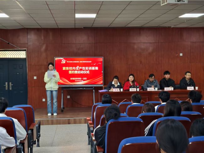 2026年4月24日,蚌埠技师学院与江苏京东信息技术有限公司在我校举行京东校内生产性实训基地签约暨启动仪式。参会的有经贸系苏玉杰主任、年惠副主任、李敏钰副主任和京东校企合作客服运营部主管秦梦疑、侯臣阔及六十名学生代表。启动仪式标志着双方合作进入深化升级新阶段,也是我校深化产教融合、推进“岗课赛证”综合育人的重要里程碑。