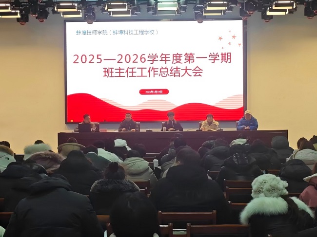 2026年1月19日,蚌埠技师学院组织召开2025—2026学年度第一学期班主任工作总结大会,交流分享育人经验,进一步提升班级管理效能与学生工作水平。院党委委员、副院长陈垚出席会议并讲话,各系部负责人、学生处全体工作人员以及全体班主任参加会议。大会由学生处副处长余翔主持。本次大会分为上午分组交流与下午集中大会两个阶段。