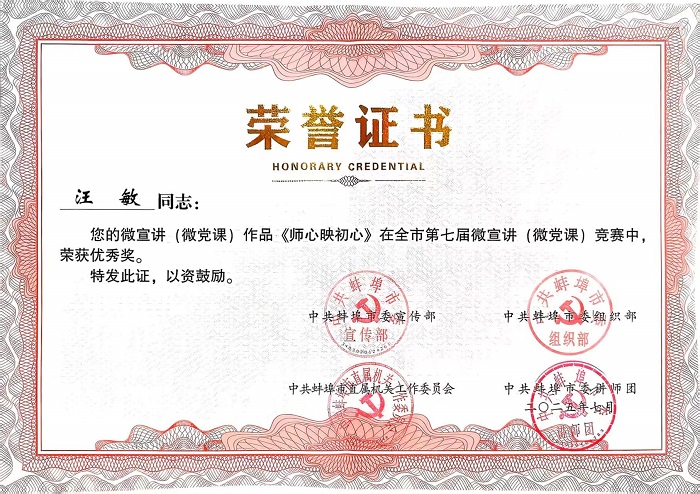 坚守师心映初心,载誉而归展风采 ——公共服务系汪敏同志荣获蚌埠市第七届微党课宣讲竞赛优秀奖