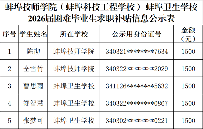 附件:蚌埠技师学院(蚌埠科技工程学校) 蚌埠卫生学校2026届困难毕业生求职补贴信息公示表