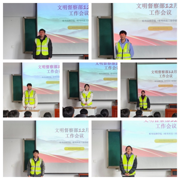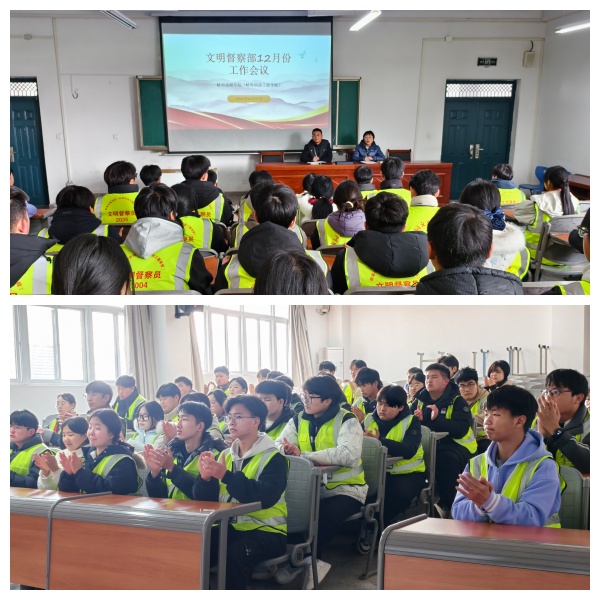 12月17日中午12:40,我院学生处组织召开文明督察队月度工作会议。学生处处长李恪出席会议并讲话,全体督察员参会。会议由学生处副处长房慧萍主持。旨在总结过往工作,表彰先进典型,凝聚队伍力量,持续推动校园文明建设。