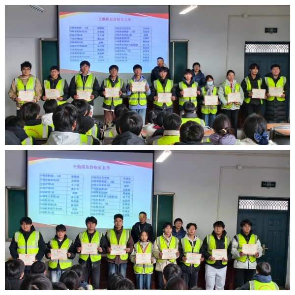 会议还对11月份表现出色的督察员进行了表彰。依据日常考勤与工作表现,一批恪尽职守、全勤参与的“全勤模范督察员”获得荣誉。学生处领导为他们颁发了奖状,勉励他们珍惜荣誉,再接再厉,并号召全体队员向榜样看齐,以更扎实的作风、更昂扬的姿态,共同营造更加和谐、文明、有序的校园环境。