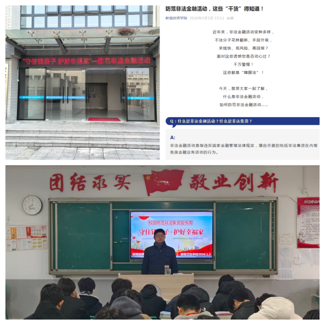 为落实上级防范非法集资宣传部署,守护学生及家庭财产安全,近期蚌埠技师学院以“守住钱袋子・护好幸福家”为核心,开展“校园防范非法集资”系列宣传教育活动,为师生及家长筑牢金融安全“防火墙”。